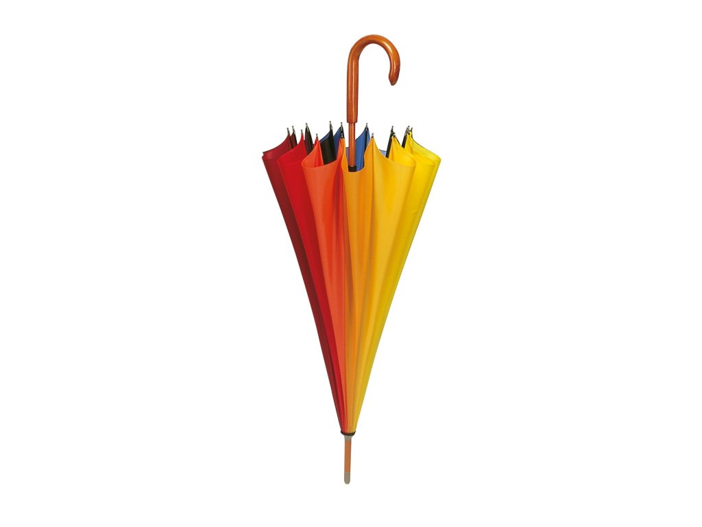 Oblíbený duhový deštník s dřevěnou rukojetí a holí.