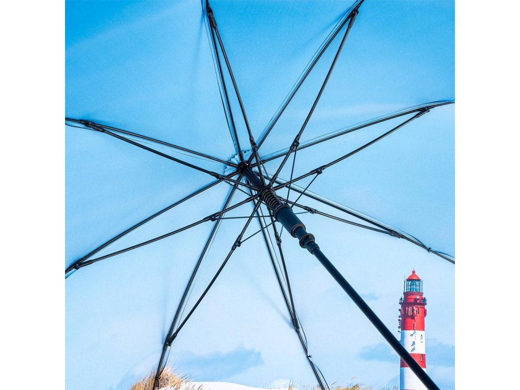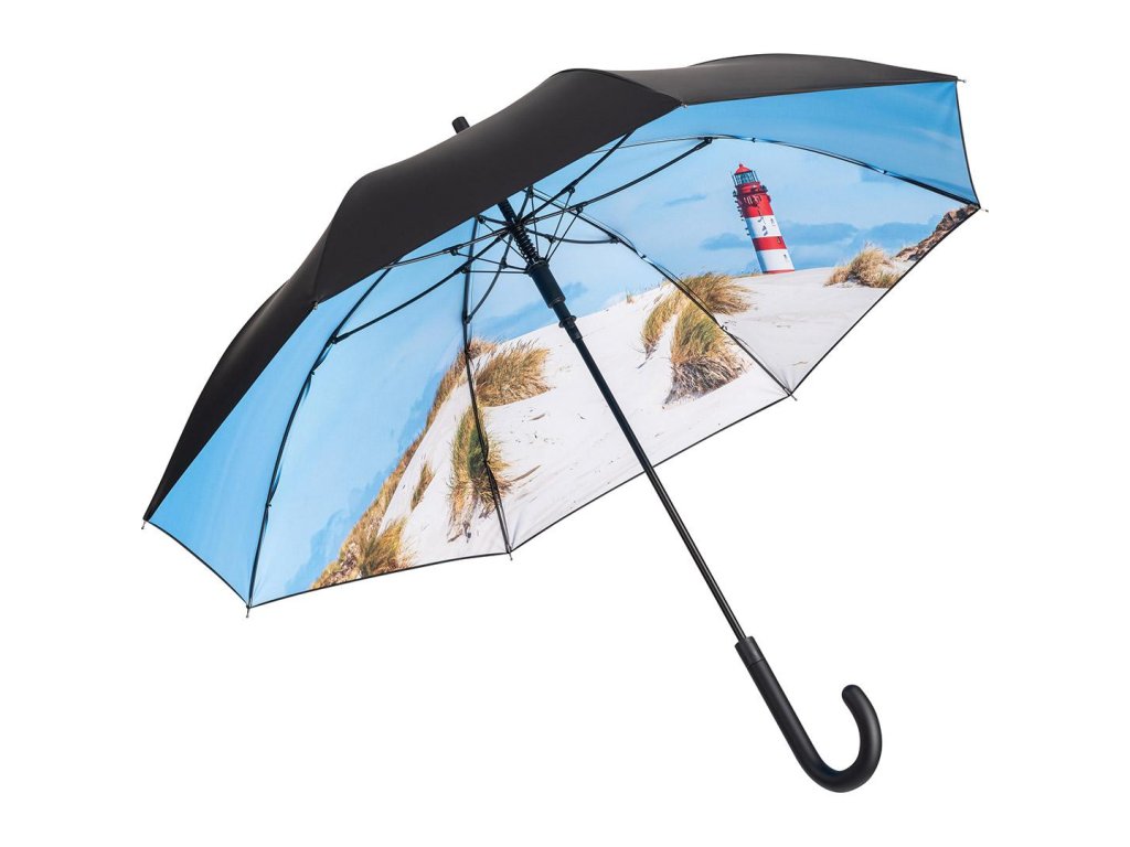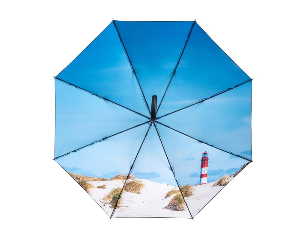Unikátní deštník značky FARE s uklidňujícím vnitřním fototiskem písčité pláže a majáku.