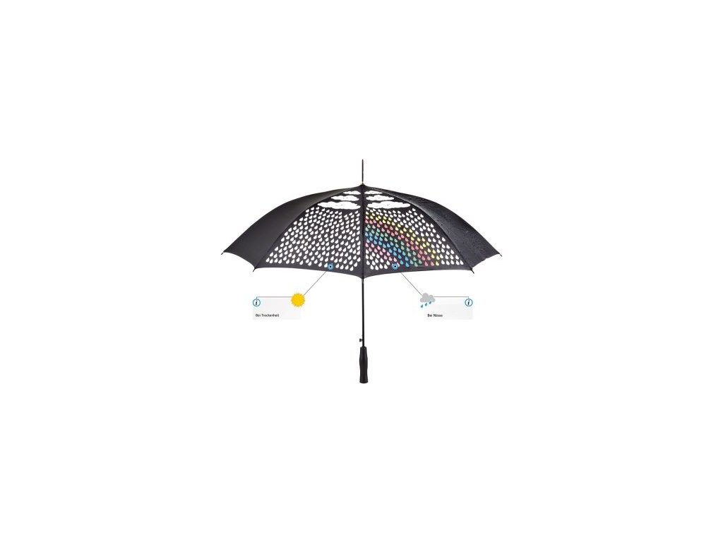 Kouzlo je v tom, že když je deštník suchý, obrázek kapek a mráčku je bílý. Při kontaktu s vodou se na potahu objeví duha díky colormagic efektu.