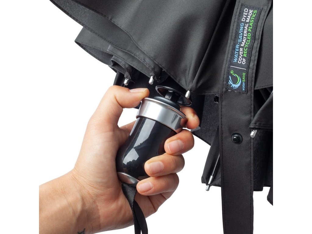 V typickom štýle FARE zodpovedá dáždnik aj otázke udržateľnosti: jeho poťahový materiál z polyesterového pongee waterSAVE® je vyrobený z recyklovaných plastov a bol farbený technológiou pre úsporu vody a energie. Pružná konštrukcia zo sklených vlákien zaisťuje odolnosť aj pri silných poryvoch vetra.
